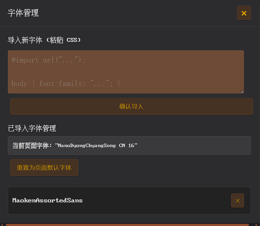 因为经常想换字体发现似乎没人搞过所以写了一个,按钮在最底下扩展那边,字体这里找https://fonts.zeoseven.com/ 点开想要的字体往下翻,点击复制css,回到酒馆黏贴到脚本的输入框里就行,应该可能也许大概,没啥bug吧?扩展版本可能会补