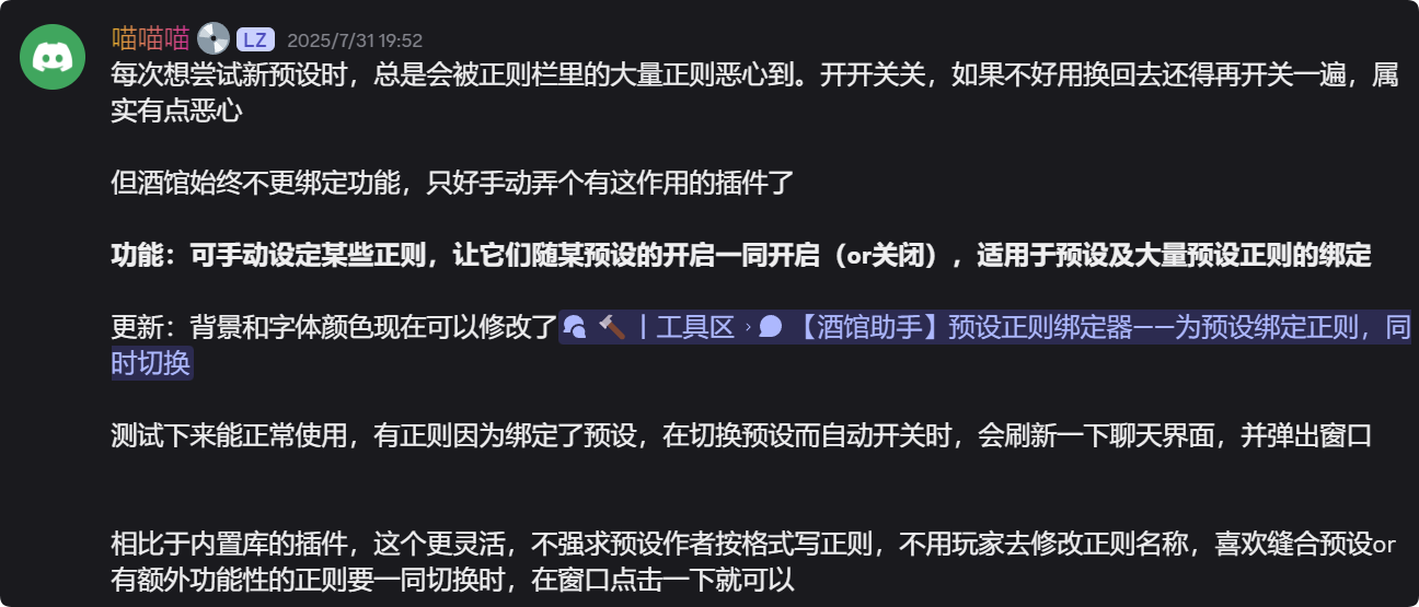 【酒馆助手脚本】预设正则绑定器——为预设绑定正则,同时切换 作者:喵喵喵